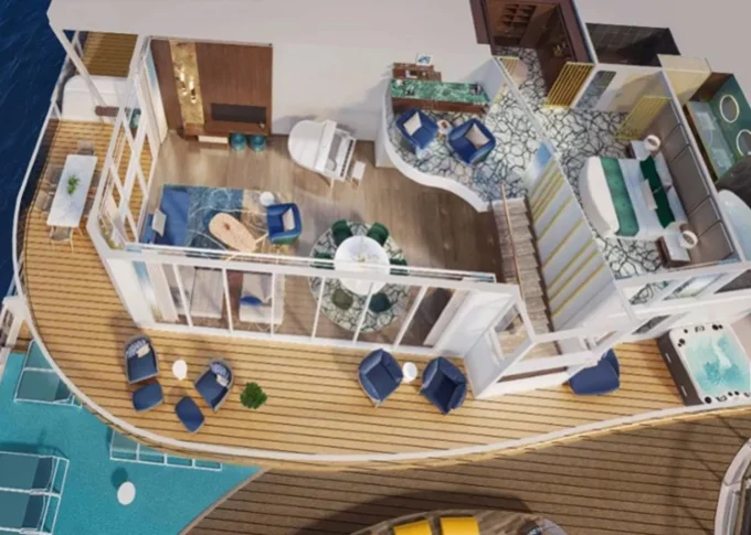 | OS - Owner’s Suite 61 m² + 17,5 m² balkón s výhľadom na more. 16,17. paluba vpredu. Max 5 osôb. Výhody Royal Suite Sky class. | 21 064 € 5 266 € za osobu | ||