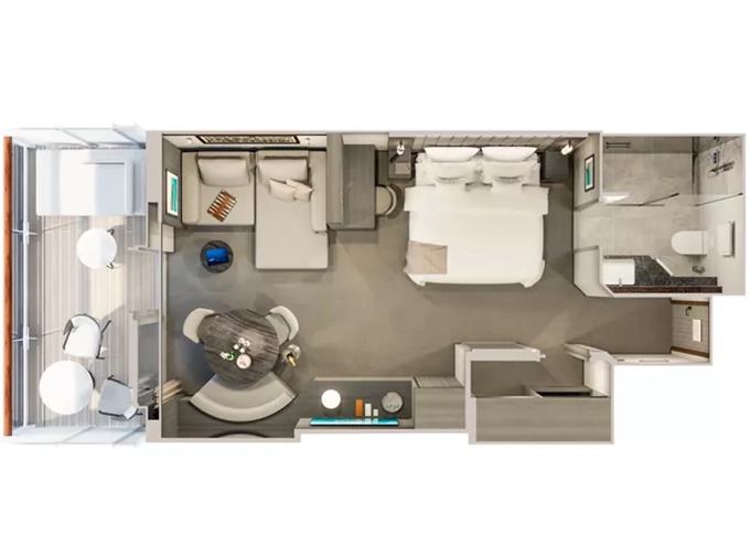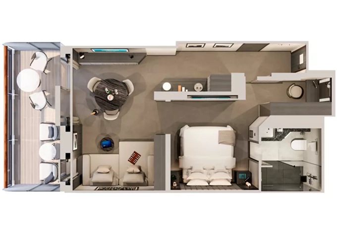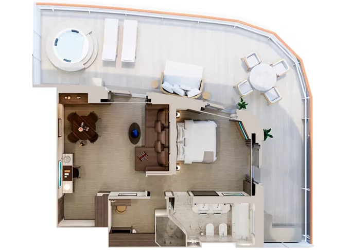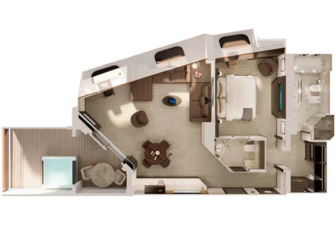 | Retreat Residence Suita 63 m² + Terasa s vírivkou a sedením 14 m² / 7. paluba: 18 m². Spálňa s obývacou a jedálenskou časťou, šatník. Koktailová súprava, minibar, kávovar, vodná kanvica, ďalekohľad, sejf, mramorová kúpeľňa s vaňou a sprchou, extra wc. Taška Technogym Case Kit. Fľaša šampanského na privítanie. Služby osobného majordóma. Maximálna kapacita 3 dospelí alebo 2 dospelí + 2 deti pod 18 rokov. | 20 985 € 6 995 € za osobu | ||