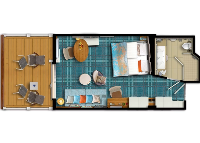 SUTO - Themen Suite 54 m² + balkón 15 m² so stolom, ležadlom a hojdacou sieťou. Spálňa, obývacia časť, šatník. 10. paluba. Max 4 osoby. Výhody Suite. 40 796 € 10 199 € za osobu