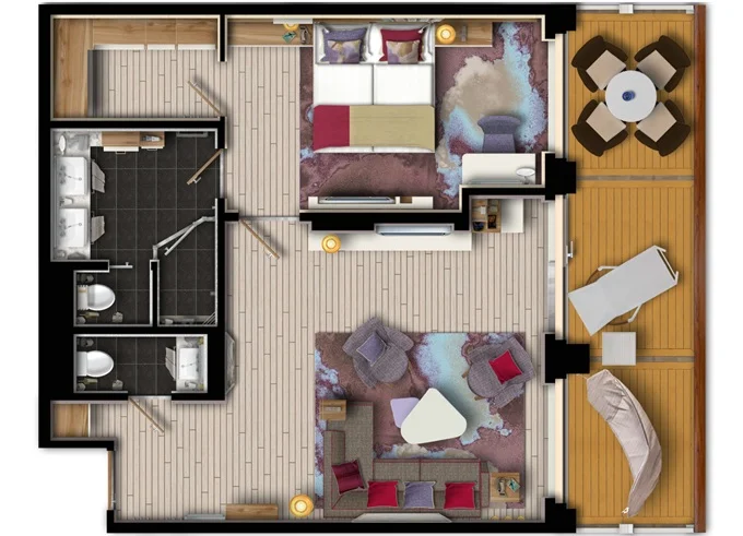 SUTO - Themen Suite 54 m² + balkón 15 m² so stolom, ležadlom a hojdacou sieťou. Spálňa, obývacia časť, šatník. 10. paluba. Max 4 osoby. Výhody Suite. 20 398 € 10 199 € za osobu
