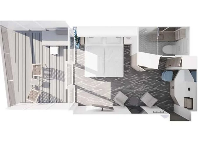 | VKKO - Kajuta s terasou 20 m² + balkón 13 m² so stoličkami a váľandou. 15. paluba. Max 2 osoby. | 6 152 € 6 152 € za osobu | ||